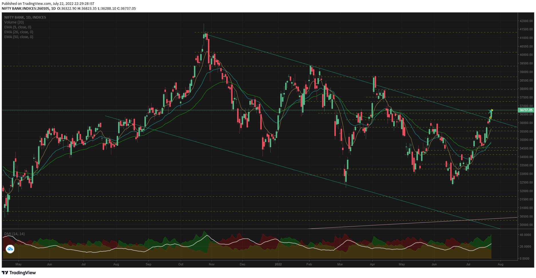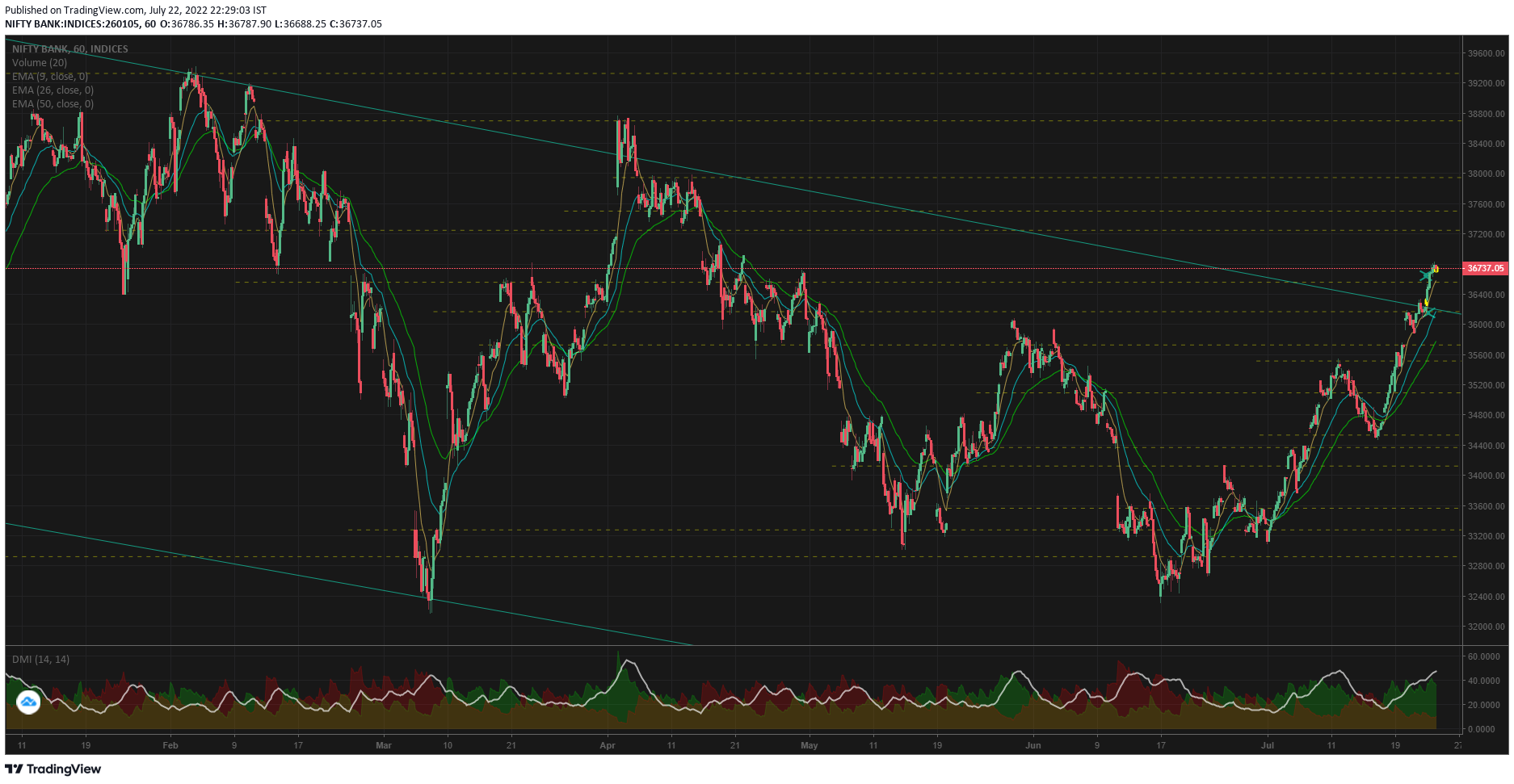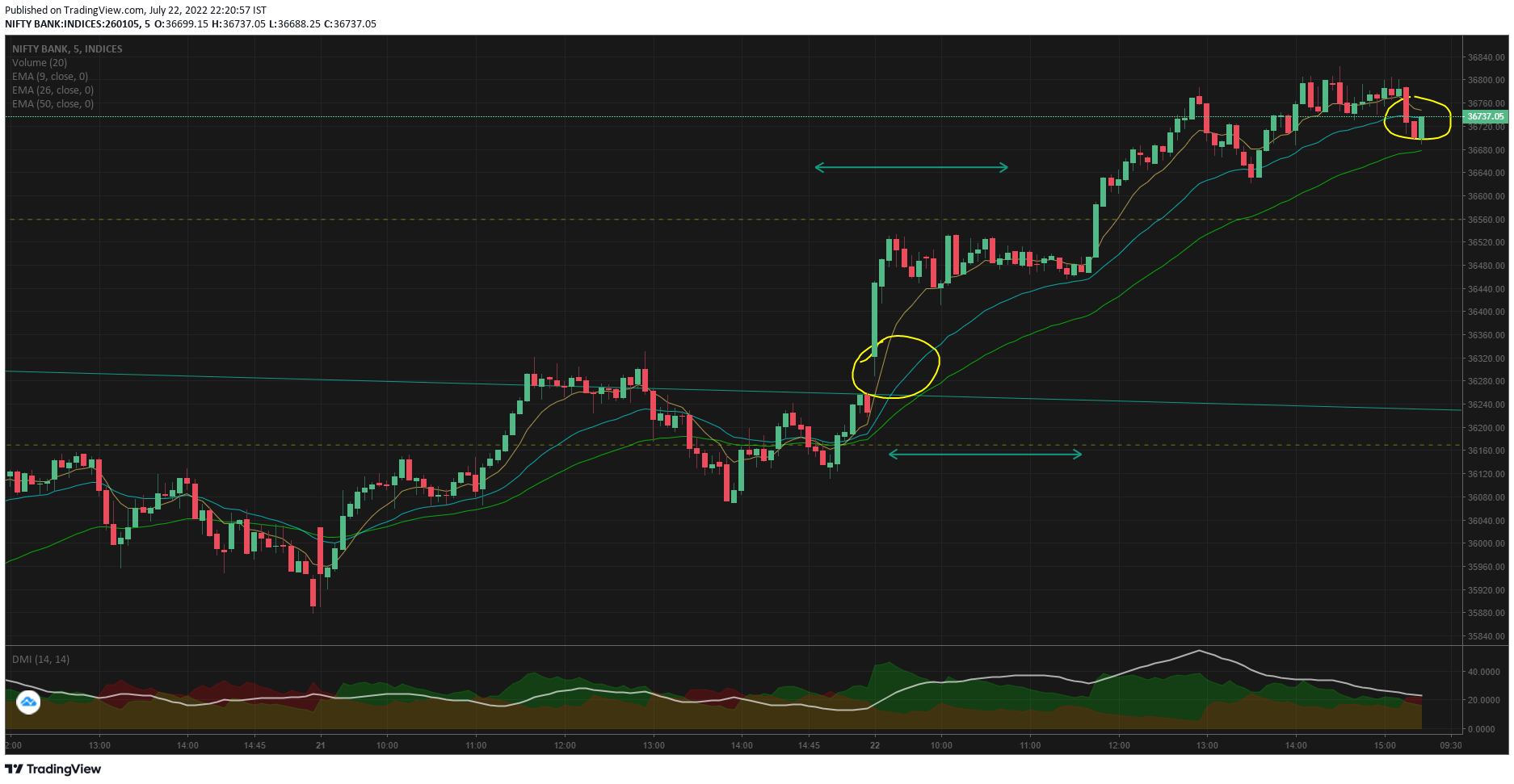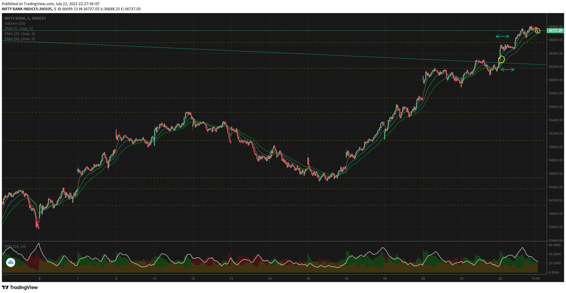 BN opened gap up at 36322 breaking yesterday's resistance line. The first candle itself was bullish that set the tone for the day. BN spent 9.25 to 11.40 below the next resistance line finally crossing in the 1 big candle at 11.45. The height of the candle indicated that they may not be any reversal for the day.